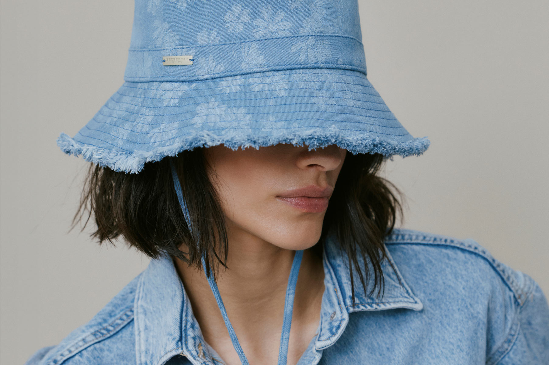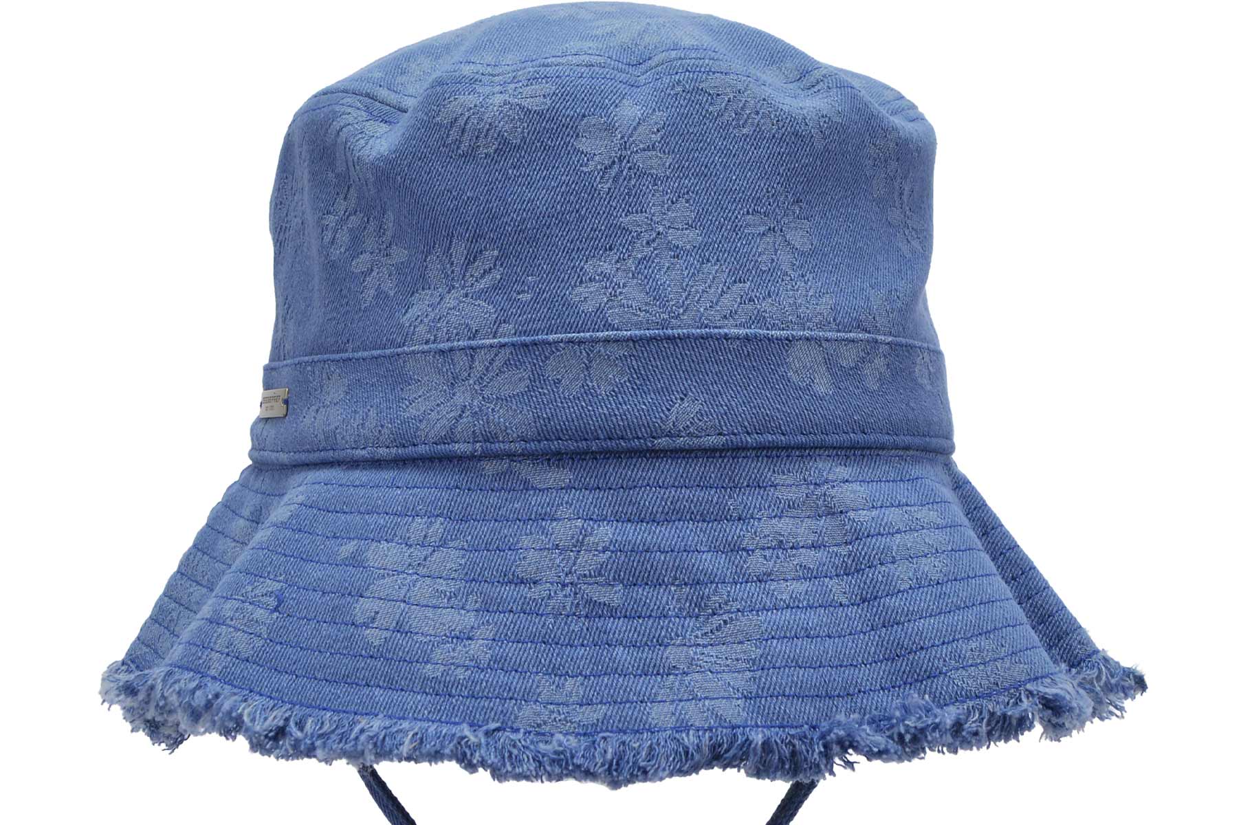 SEEBERGER Damen Stoff Hut Jeansstoff Fischerhut mit Blumenmuster und Fransenkante 55757-1