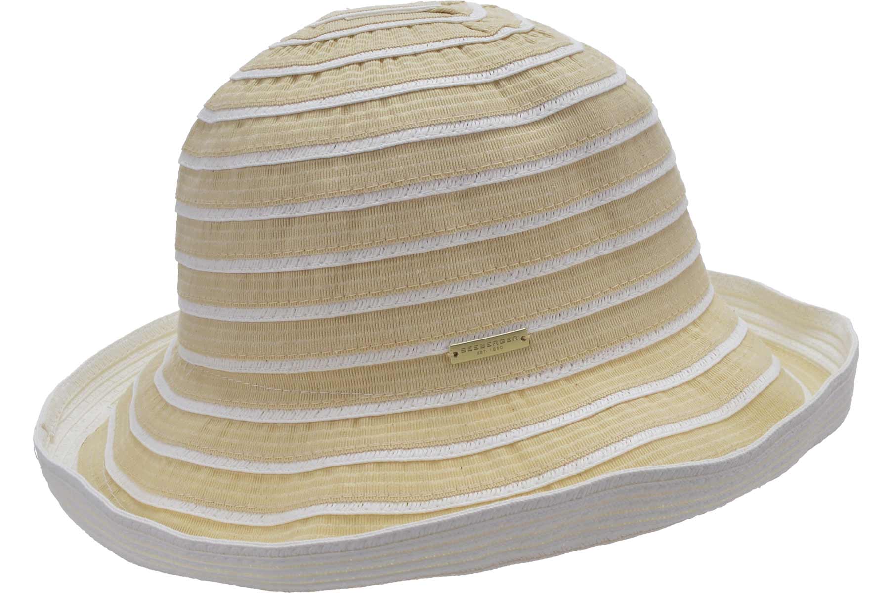 Impressingly stylish is this hat with turn up brim from Seeberger with its mix of ribbon and paper braid. Thanks to the adjustable size of the sweatband and its foldability, it is also extremely practical.